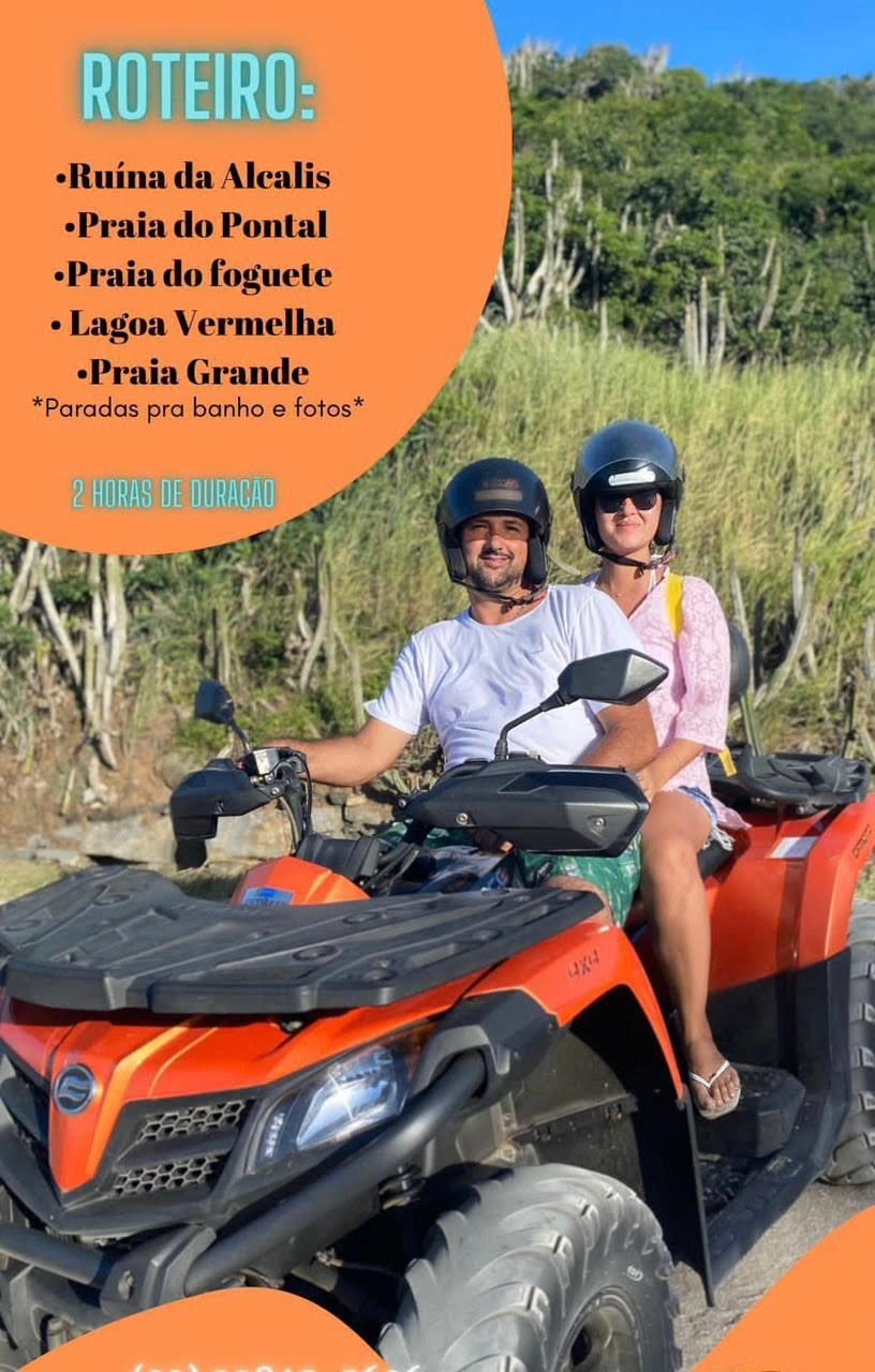 O guia vai na frente com uma moto de trilha, e os clientes vão atrás seguindo ele, cada um no seu próprio quadriciclo (podendo ir 2 pessoas em cada quadriciclo).